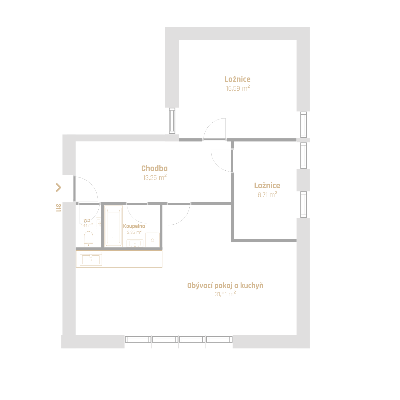 Schéma půdorysu bytu představuje předpokládané dispoziční řešení. Kuchyňské linky, nábytek a interiérové doplňky nejsou předmětem dodávky. Výměry jednotlivých místností jsou pouze orientační. Investor se tímto nevzdává práva na případné úpravy či doplnění marketingového materiálu.